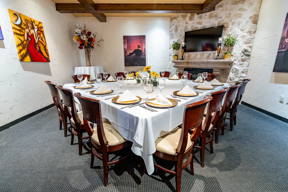 A warm, fully private space designed for intimate gatherings, the Padrino Room features a working fireplace and flat-screen TV. Ideal for business dinners, private celebrations, or discreet gatherings, it offers a cozy, refined setting with personalized service.