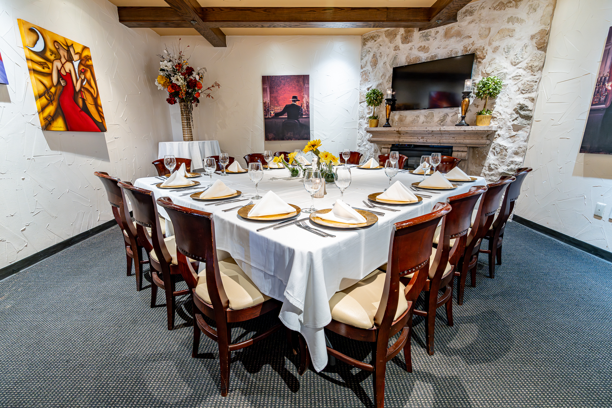 A warm, fully private space designed for intimate gatherings, the Padrino Room features a working fireplace and flat-screen TV. Ideal for business dinners, private celebrations, or discreet gatherings, it offers a cozy, refined setting with personalized service.